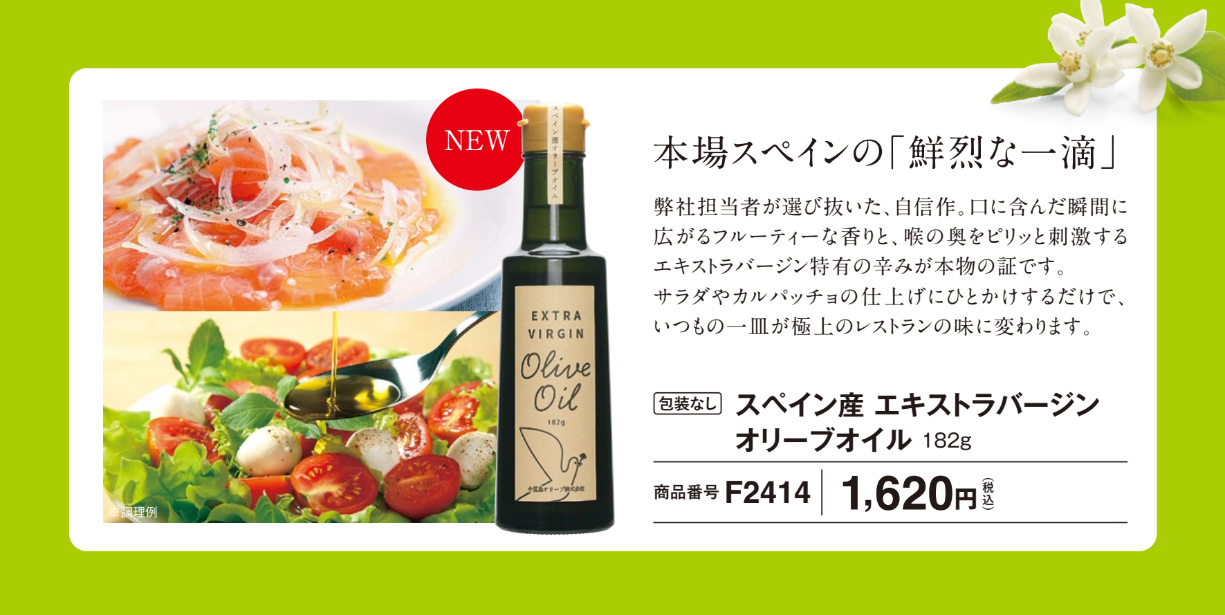 スペイン産エキストラバージンオリーブオイルの香りと辛みが、いつもの料理を至高の一品に仕上げます。サラダやカルパッチョにおすすめ。