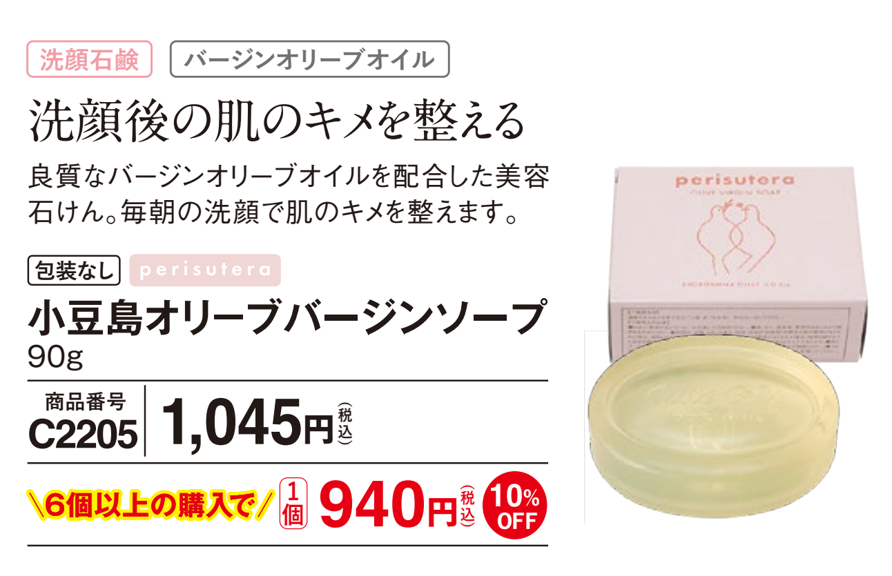 弊社オリジナルのスキンケアブランド「ペリステラ」がお届けする、お肌に優しい美容石けん。良質なバージンオリーブオイルを使用しています。毎朝の洗顔におすすめ。