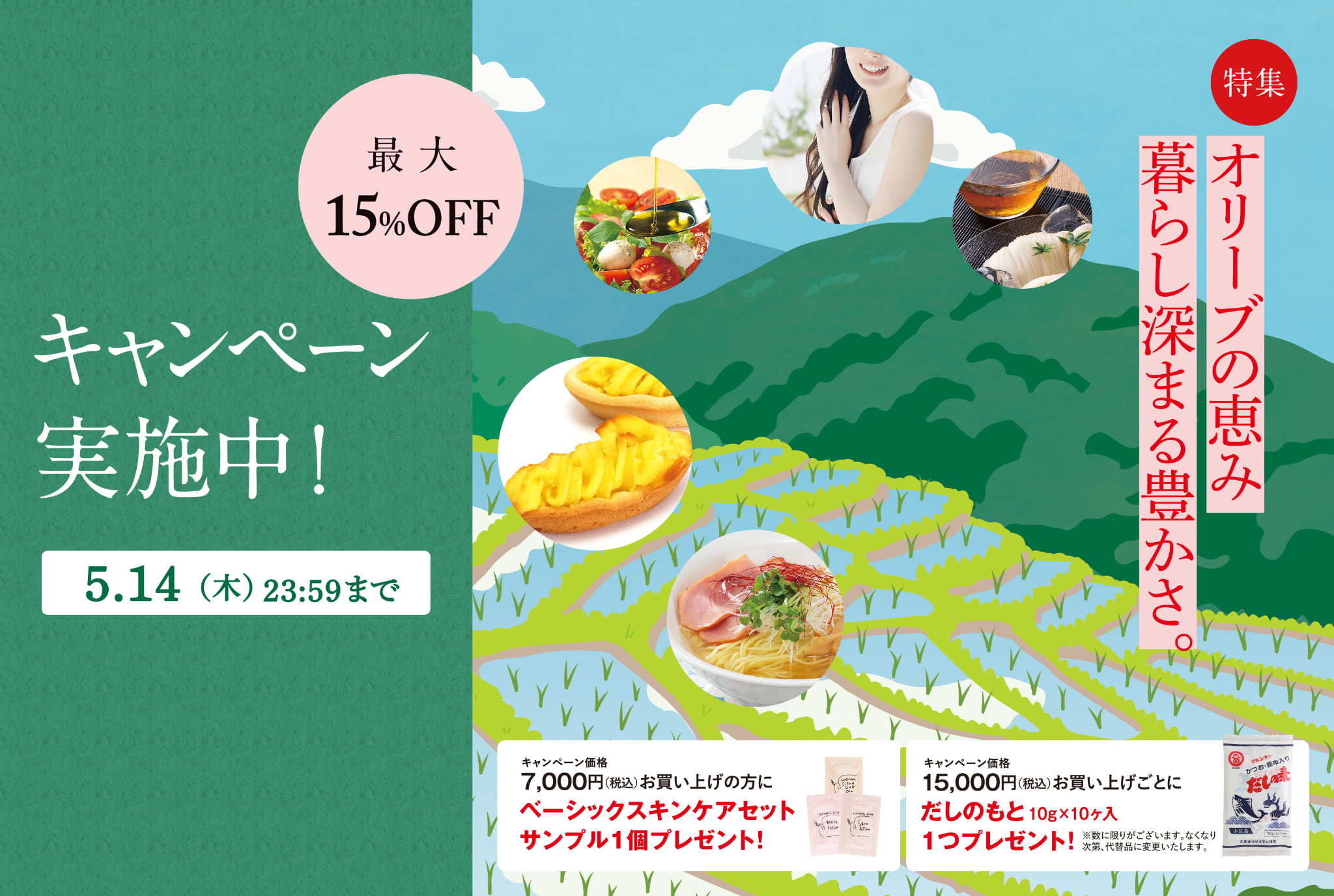 小豆島産の食材を使ったグルメや、オリーブの成分を活かしたブランド「ペリステラ」のお肌に優しいスキンケアグッズを、キャンペーン価格でお求めいただけます。