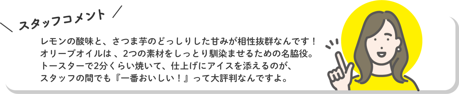 | 原材料名 | 白餡(国内製造)、サツマイモペースト、砂糖、小麦粉、マーガリン、ショートニング、鶏卵、こんにゃくペースト、加糖練乳、ブドウ糖、レモン果汁、食用オリーブ油/香料、乳化剤、着色料(クチナシ、アナトー)、酸化防止剤(ビタミンE)、安定剤(ペクチン)、(一部に小麦・乳成分・卵・大豆を含む) |