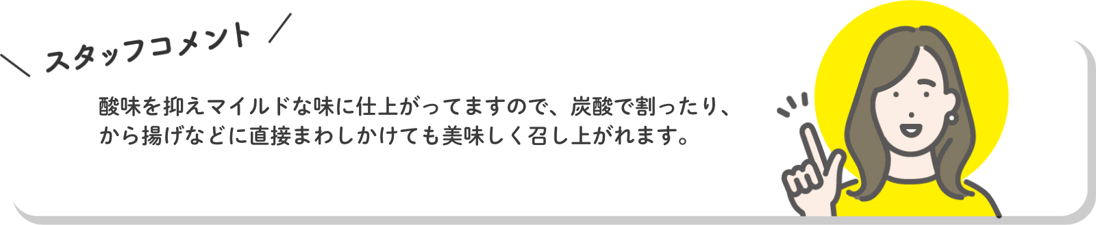 酸味控えめのお酢。調味料としてはもちろんドレッシングやお酒を割るのにもおすすめ。
